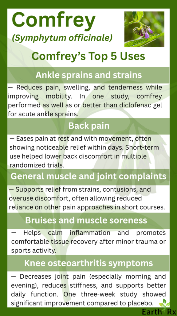 - D’Anchise R, et al. Comfrey extract ointment vs diclofenac gel for ankle sprains. Arzneimittelforschung. 2007.