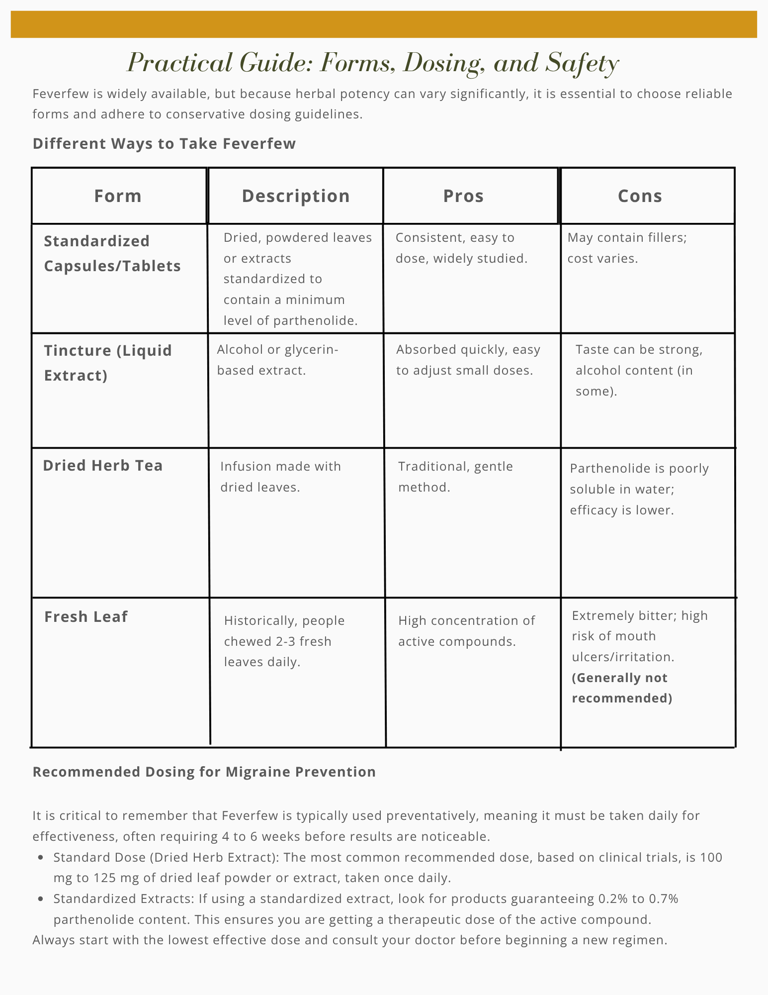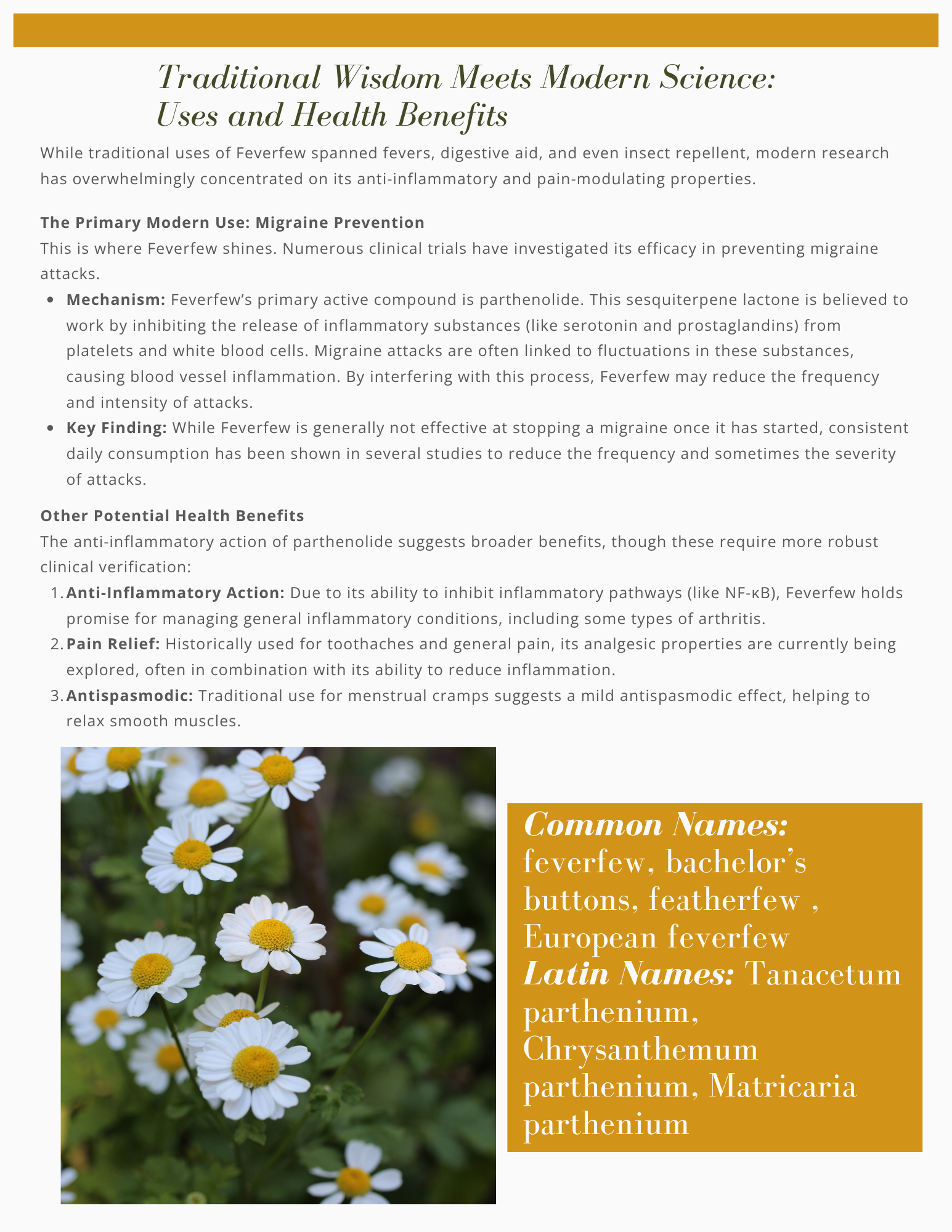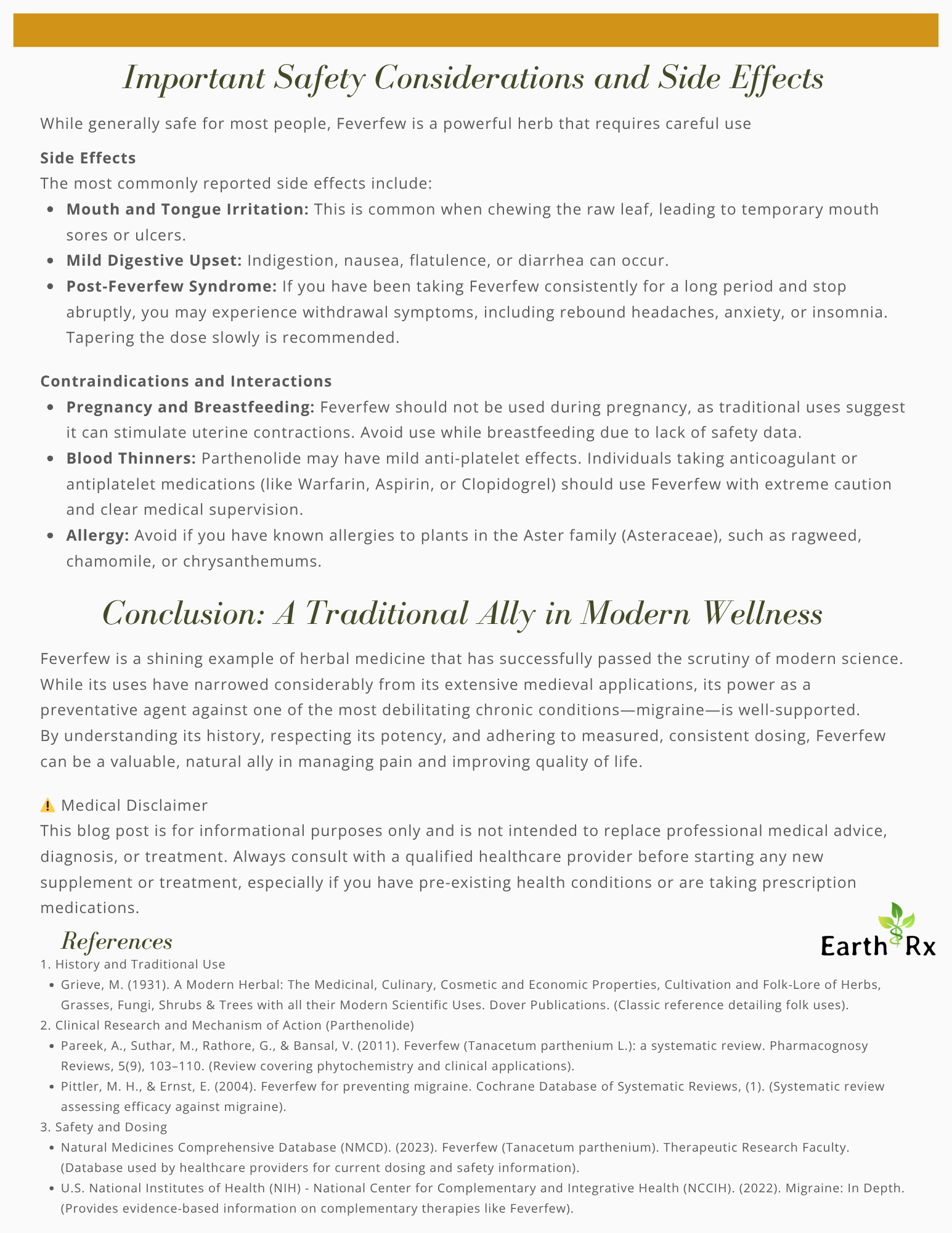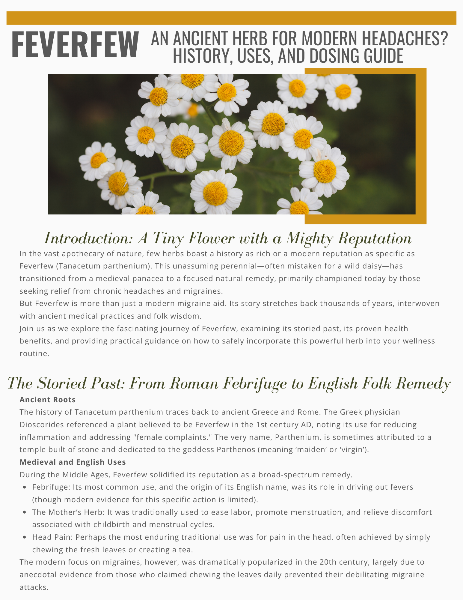 Feverfew: History, Uses, and Dosing Guide Leave a Comment / All Posts, Herbs & Spices / By Earth Rx An Ancient Herb for Modern Headaches?